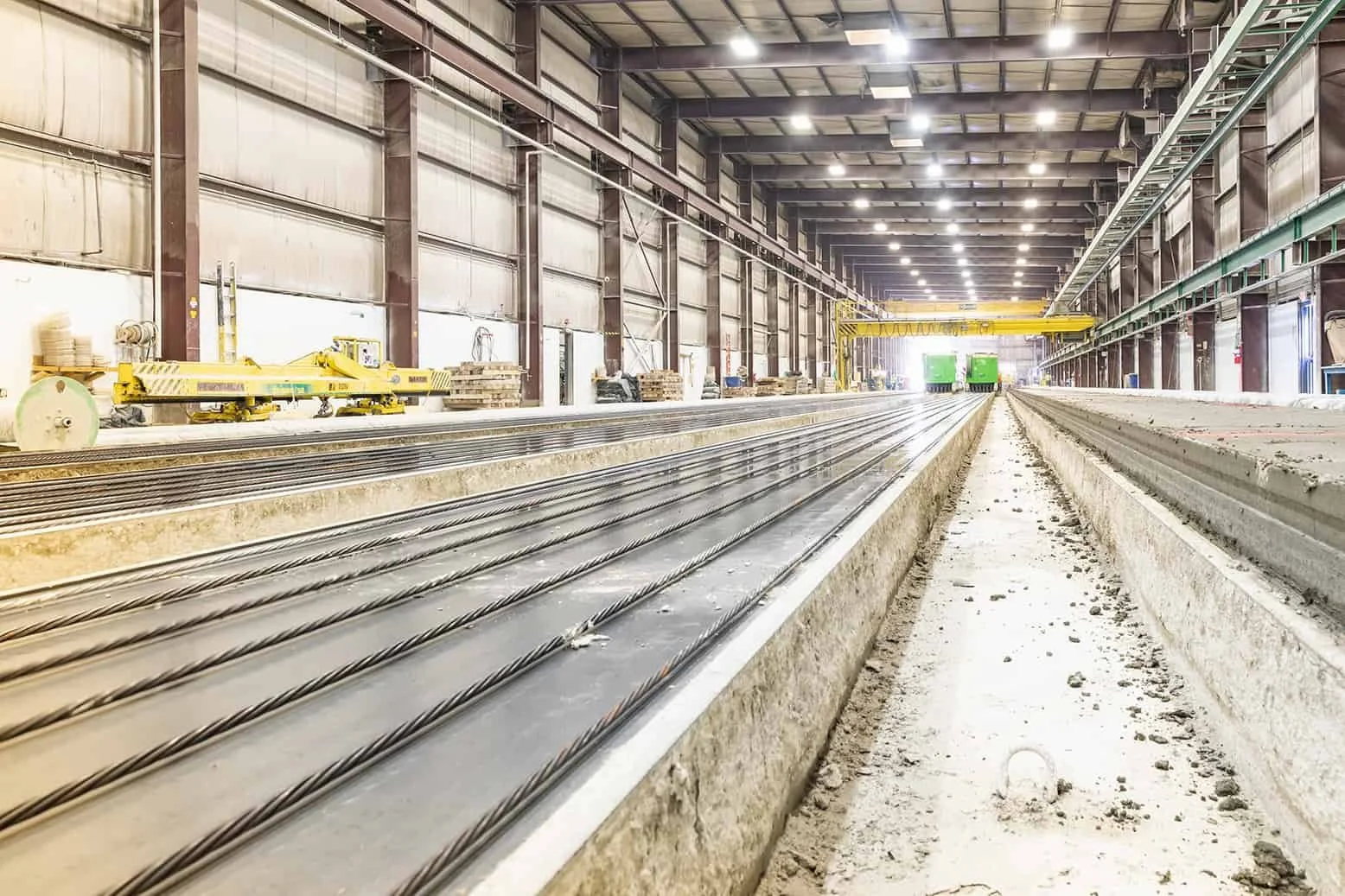 Once the concrete reaches its target strength, prestressing strands are released, transferring compression into the concrete element.